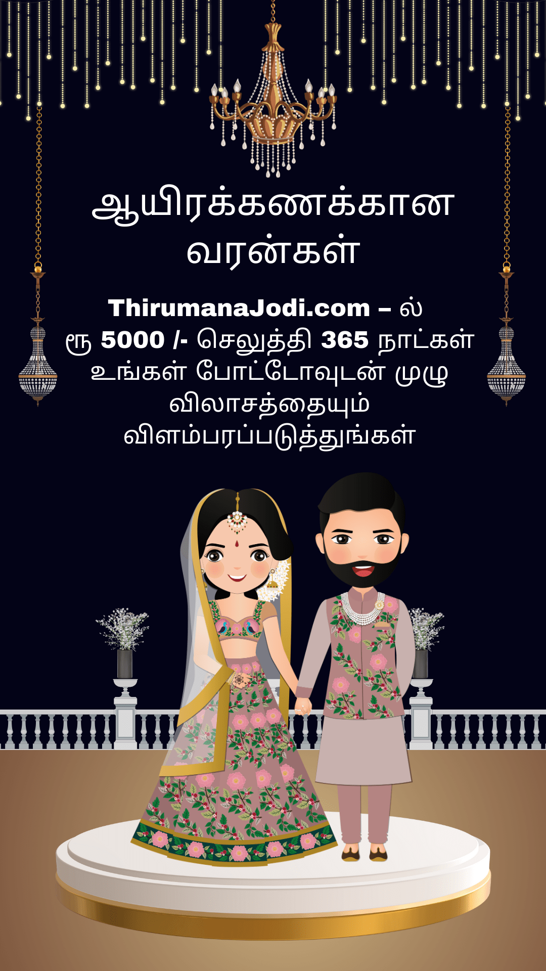 திருமணத்திற்கு வரன் தேடுகிறீர்களா? உங்கள் சமூகத்திலிருந்து ஆயிர கணக்கான மாப்பிள்ளைகள் மற்றும் மணப்பெண்களைக் கண்டறியவும். தமிழகமெங்கும் கிராமம் முதல் நகரம் வரை...